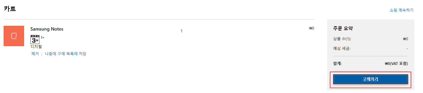 Samsung Notes의 무료를 클릭하지 마시고 ... 을 클릭하여 카트에 추가를 선택합니다.