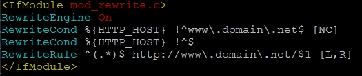 RewriteRule ^(.*)$ http://www\.domain\.com/$1 [L,R]