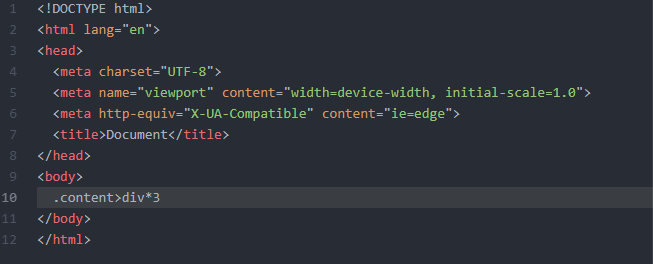 원하는 클래스가 들어간 경우 : .content>div*3 + TAB