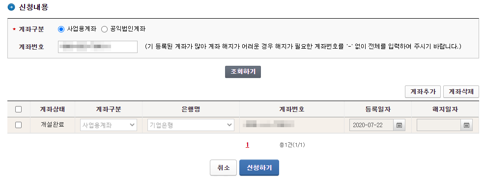 조회된 계좌번호의 내용을 확인 후 신청하기를 합니다.