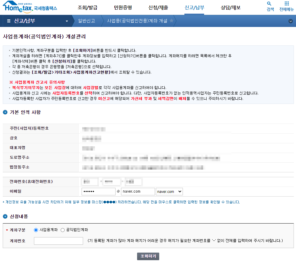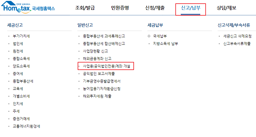 홈택스의 신고/납부 메뉴의 일반신고 > 사업용(공익법인전용)계좌 개설을 선택합니다.