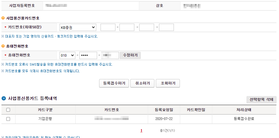카드번호와 휴대전화번호를 입력 후 등록을 합니다.