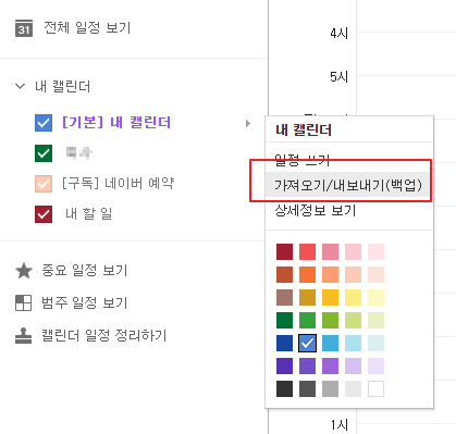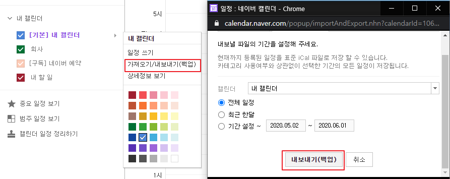 1. 내가 내보내기를 할 캘린더를 선택 후 "가져오기/내보내기(백업)"을 클릭합니다.