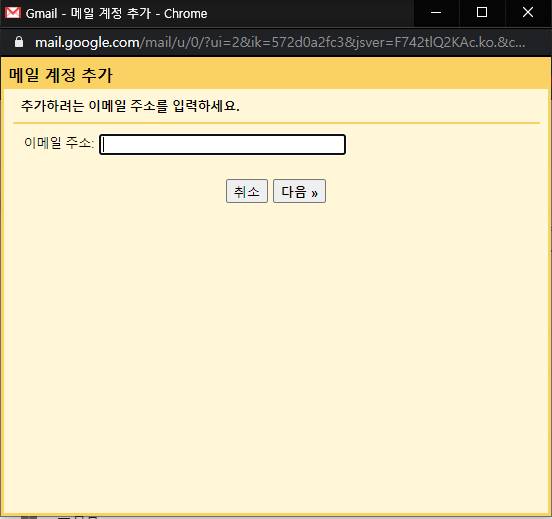 메일 계정 추가 팝업창에서 가져오려고 하는 네이버 메일 주소를 넣고 다음을 클릭합니다.