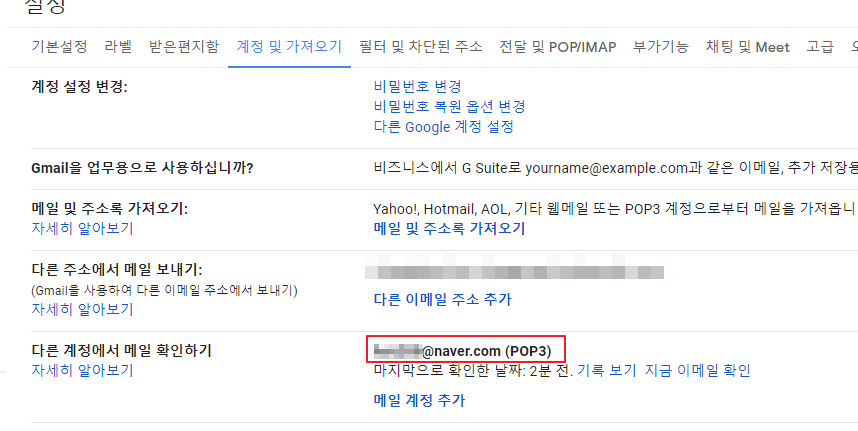 설정이 끝나게 되면 "다른 계정에서 메일 확인하기"에 입력한 이메일주소가 나오게 됩니다.