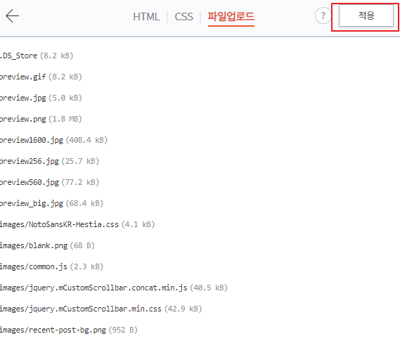 압축 파일을 해제 후 업로드를 한 후 적용 버튼을 클릭합니다.
