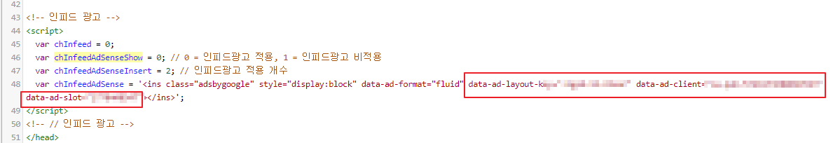 - chInfeedAdSenseInsert 값을 통해서 목록 사이에 몇 개를 노출할 것인지 결정하면 됩니다.
