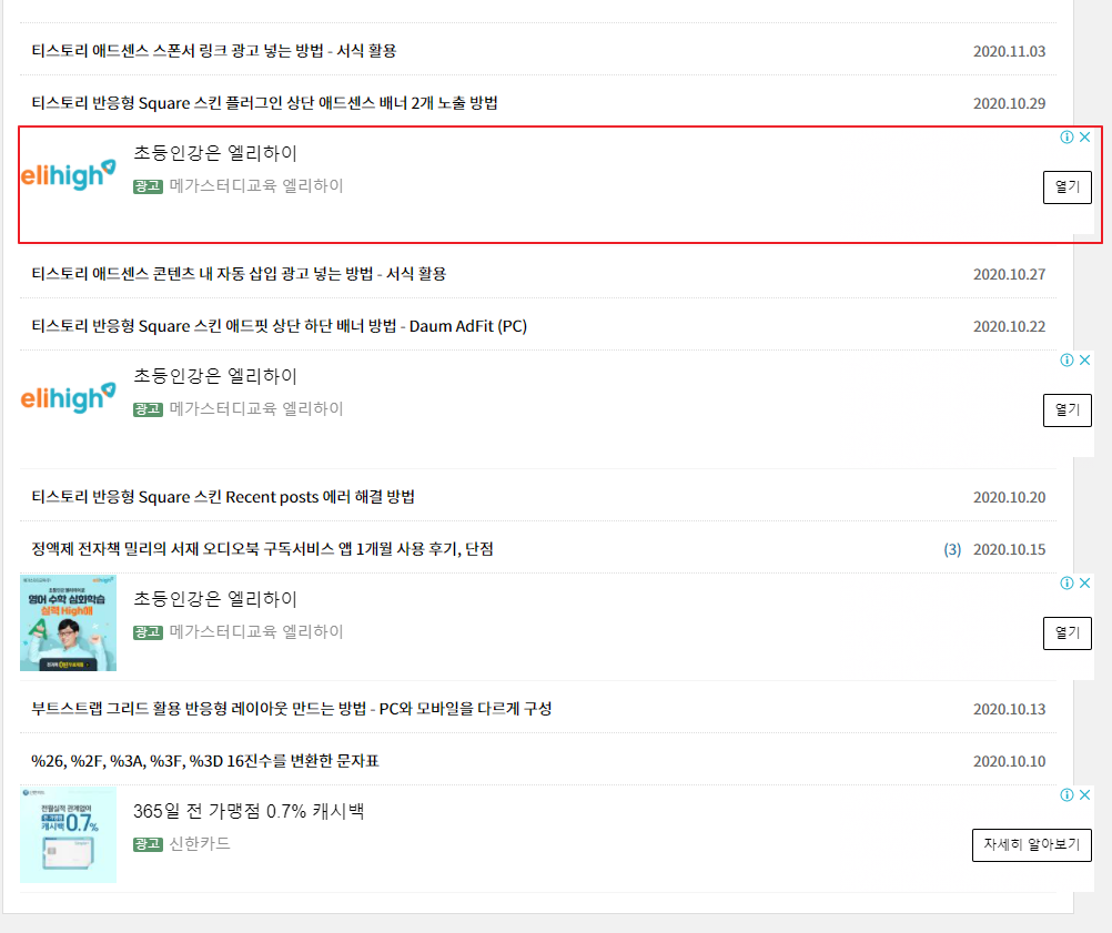 2020/10/29 - [유용한 활용팁] - 티스토리 반응형 Square 스킨 플러그인 상단 애드센스 배너 2개 노출 방법