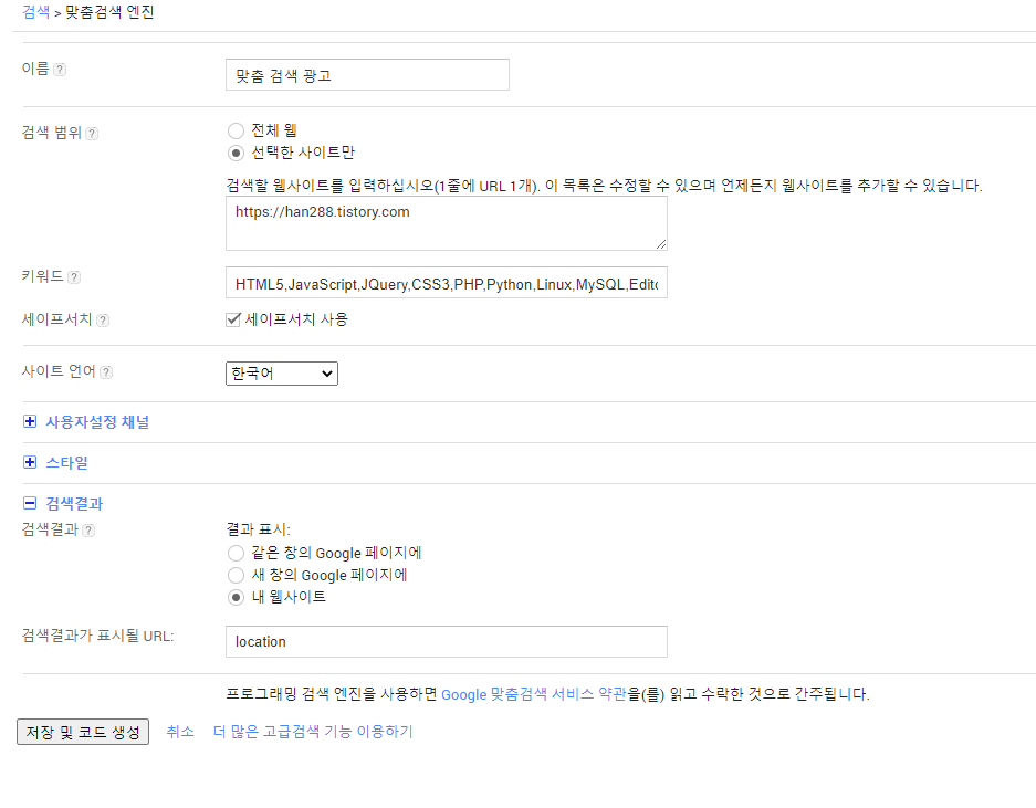 아래와 같이 애드센스 검색용 광고 맞춤검색 엔진 검색창과 검색결과 코드 완성되었습니다.