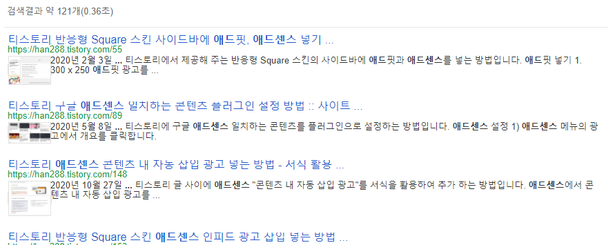 티스토리 반응형 Square 스킨에서 애드센스 검색용 광고 맞춤검색 엔진으로 검색 결과 모습입니다.