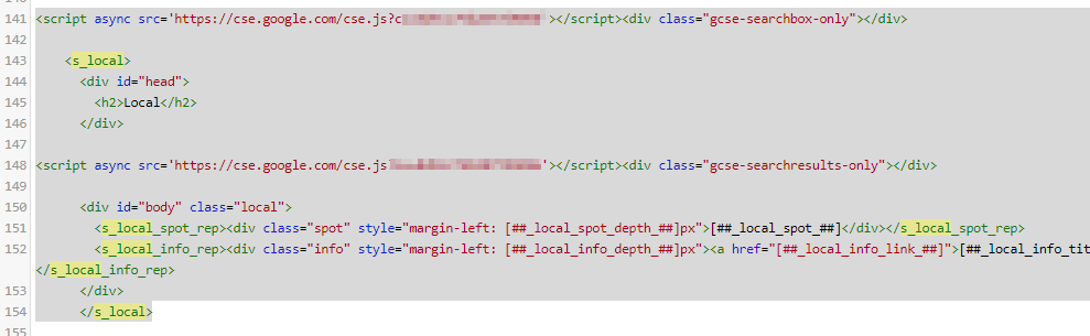 소스코드에서 <s_local> 코드를 찾아서 바로 위에 검색창 소스코드를 추가하고, <div id="head"> ~ <div> 아래에 검색결과 소스코드를 추가합니다.