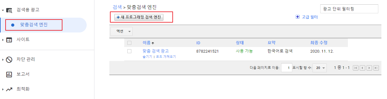 애드센스 좌측 메뉴 검색용 광고 > 맞춤검색 엔진을 선택 후 새 프로그램밍 검색 엔진을 클릭합니다.