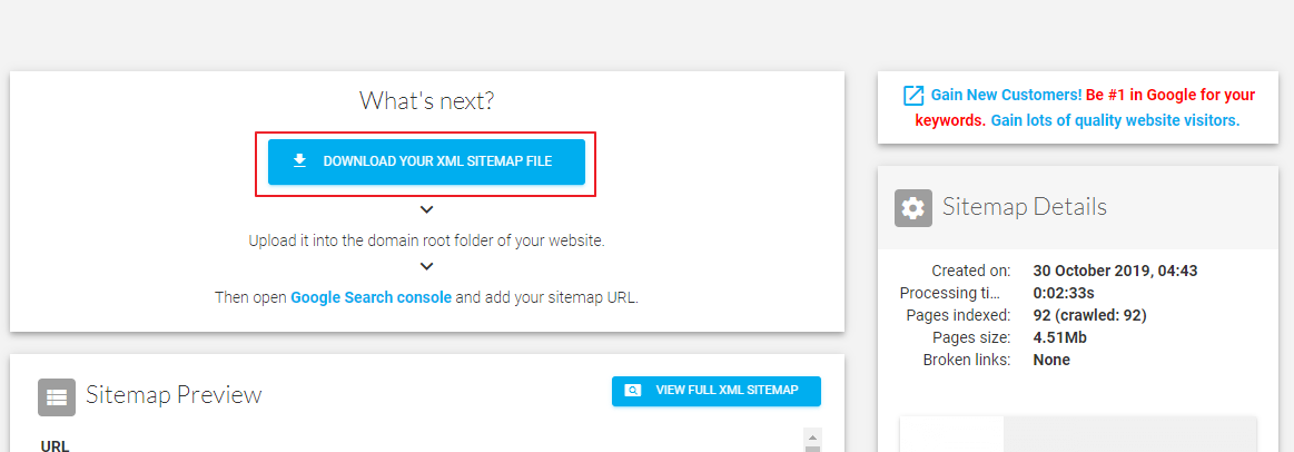 생성이 완료되었으면 "DOWNLOAD YOUR XML SITEMAP FILE" 버튼을 클릭합니다.