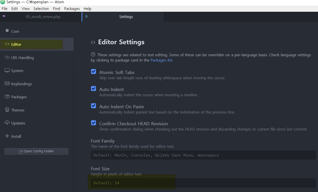 HTML5, CSS3, JavaScript, PHP 에디터 편집기 아톰(atom)에서 글자(폰트,Font) 크기(사이즈,Size) 변경 방법하는 방법입니다.