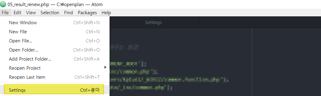 아톰 → File → Settings(Ctrl+콤마)를 클릭합니다.