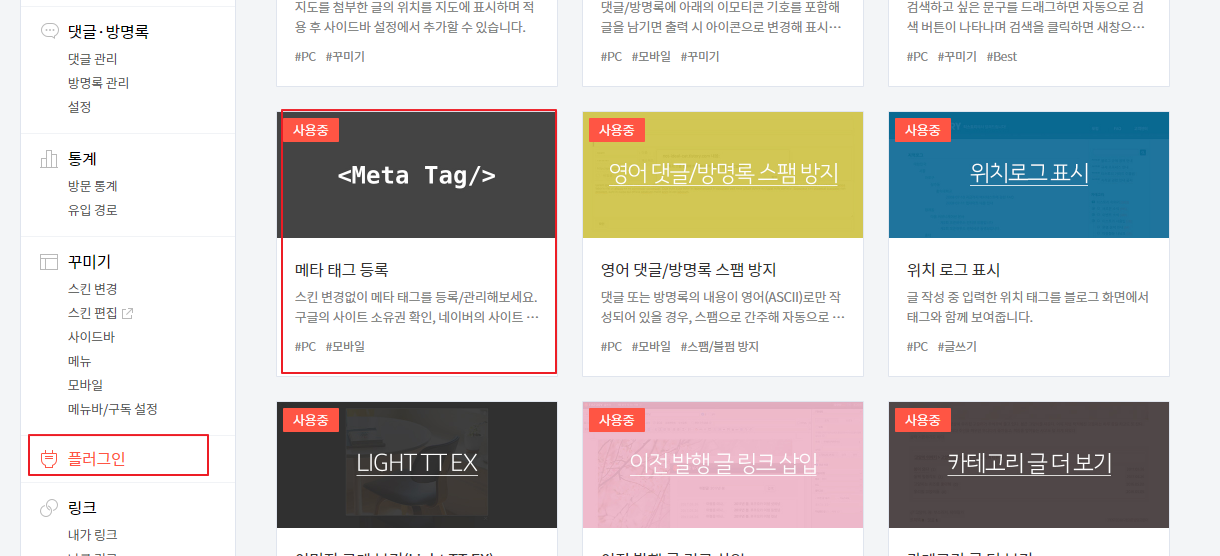 1. 관리자 화면에서 플러그인 메뉴 중 메타 태그 등록 플러그인을 선택합니다.