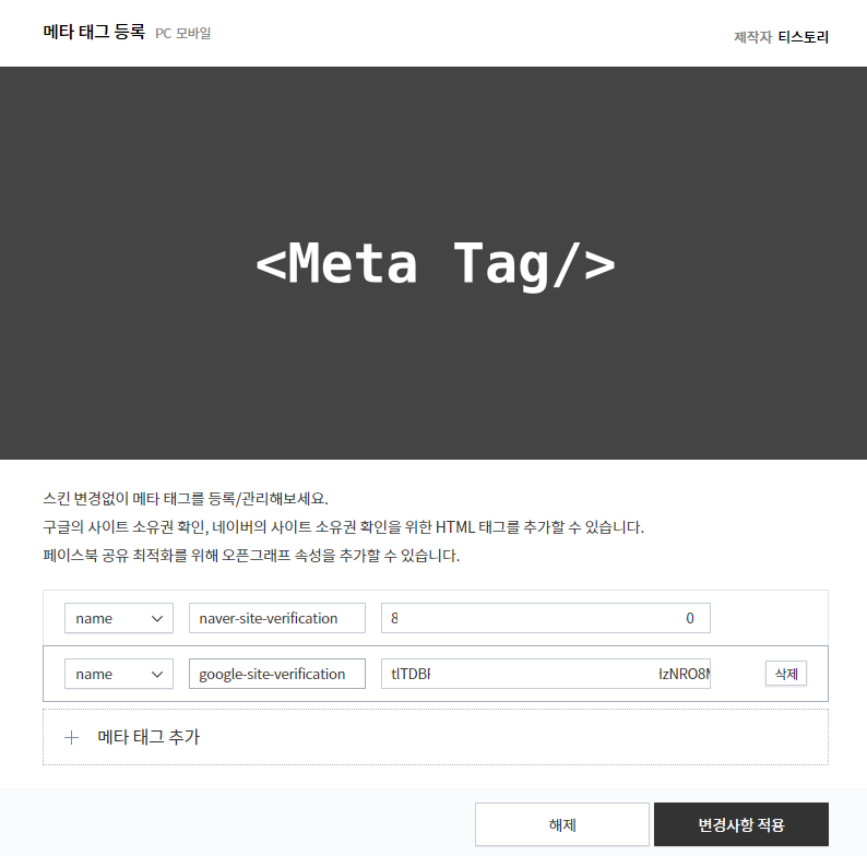 9. 티스토리 메타 태그 등록 플러그인에서 메타 태그를 추가하고 변경사항 적용을 누릅니다.