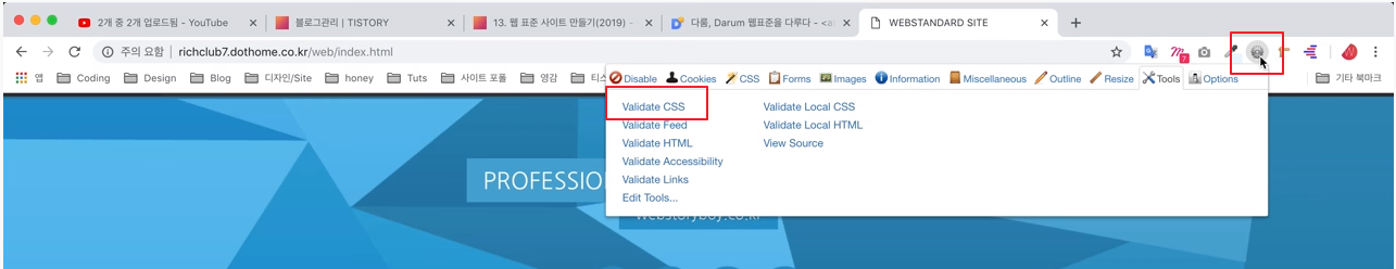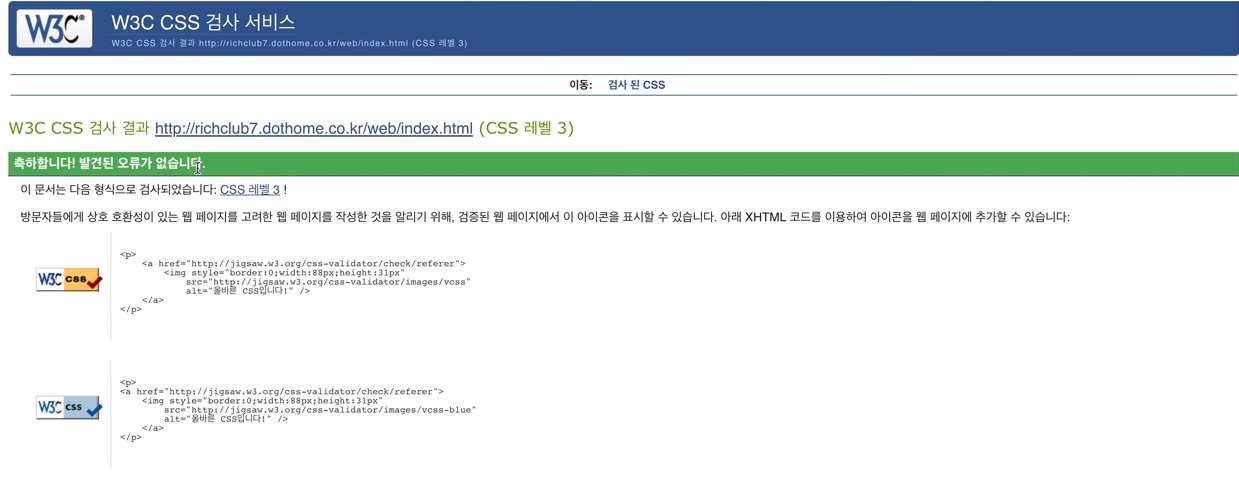 - chrome(크롬)의 web developer를 사용하게 되면 W3C CSS 검사 결과 내용이 나오게 됩니다.
