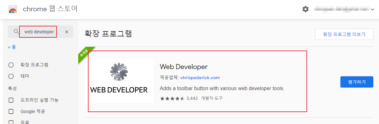 chrome(크롬)의 웹 스토어에서 web developer 검색, 설치 방법