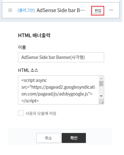 3. 추가된 사이드바의 HTML 배너출력의 편집을 눌러서 필요 내용을 넣고 저장합니다.