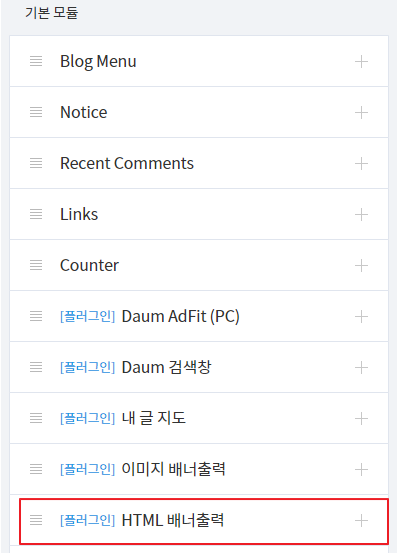 2. 사이드바의 기본 모듈에 있는 HTML 배너출력을 사이드바에 추가합니다.