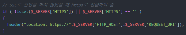 $_SEVER$_SERVER['HTTPS'] 값을 체크하여 https가 아닌 경우에 https로 바꾸는 방법입니다.
