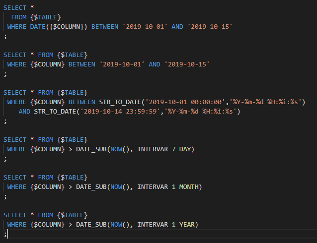 WHERE {$COLUMN} BETWEEN STR_TO_DATE('2019-10-01 00:00:00','%Y-%m-%d %H:%i:%s')