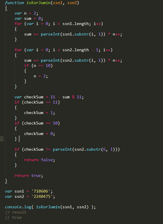 PHP가 아닌 클라이언트인 브라우저에서 Javascript로 주민등록번호 유휴성 검사를 하는 로직입니다.