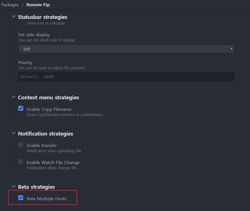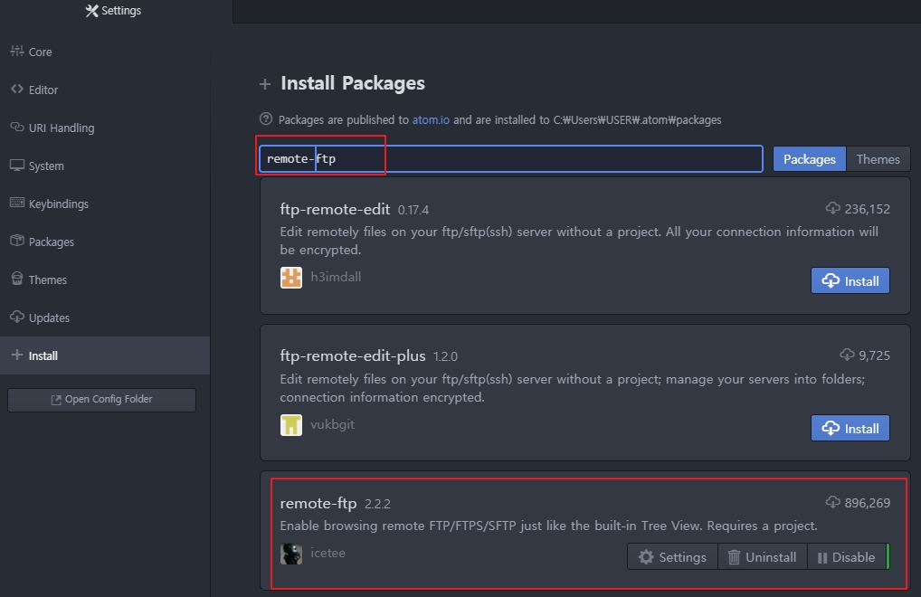 Install Packages에서 "remote-ftp"로 검색을 한 후 "remote-ftp 2.2.2"를 설치