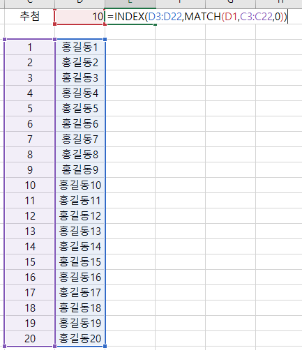 7. 예시) =INDEX(D3:D22,MATCH(D1,C3:C22,0))