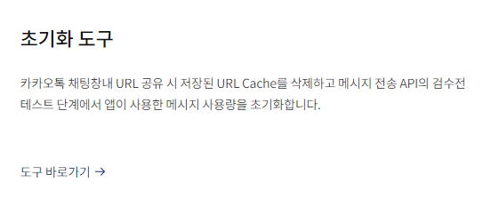 - 초기화 도구는 카카오톡 채팅창 내 URL 공유 시 저장되는 URL Cache를 삭제하고 메시지 전송 API의 검수전 테스트 단계에서 앱이 사용한 메시지 사용량을 초기화하는 도구입니다.