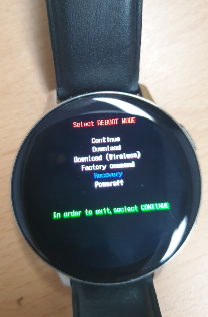 1. 갤럭시워치의 아래 버튼, 홈버튼을 10초 이상을 누르고 있으면 아래와 같은 Rebooting... 화면으로 진입을 합니다.
