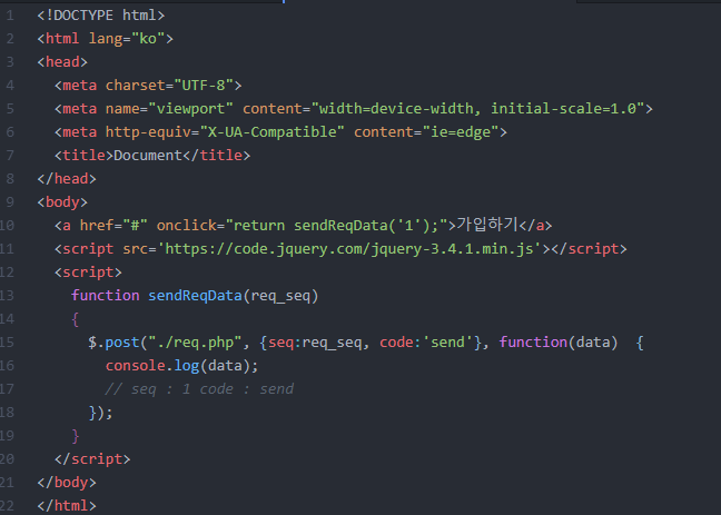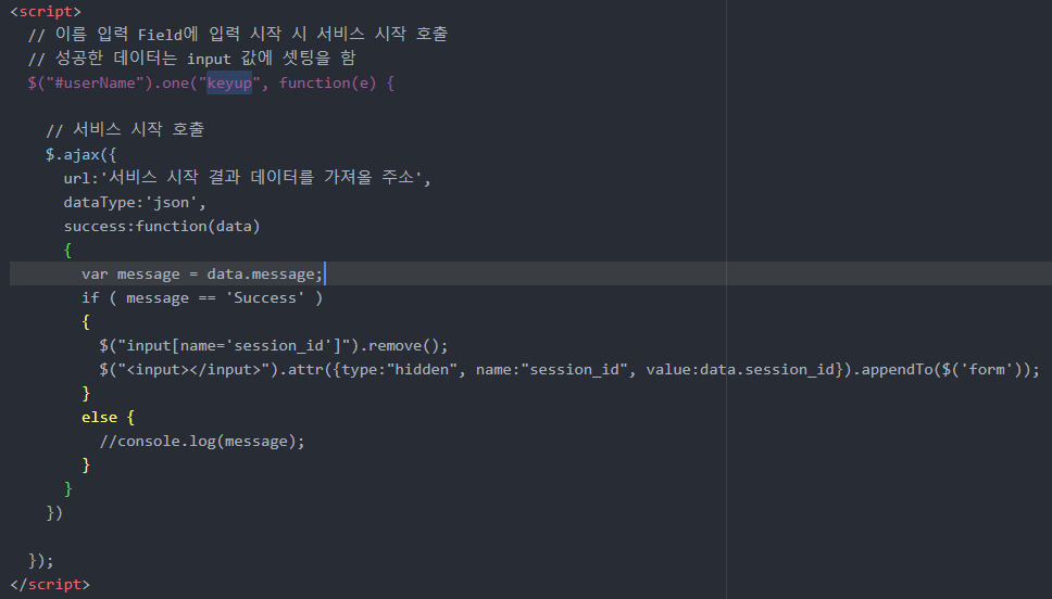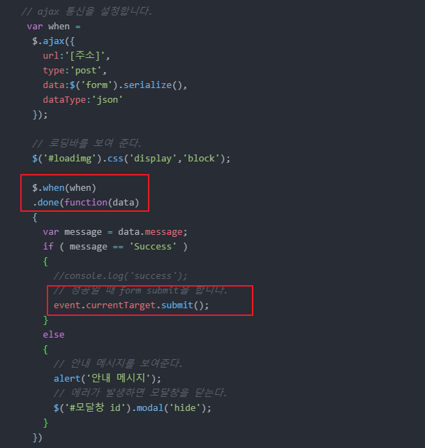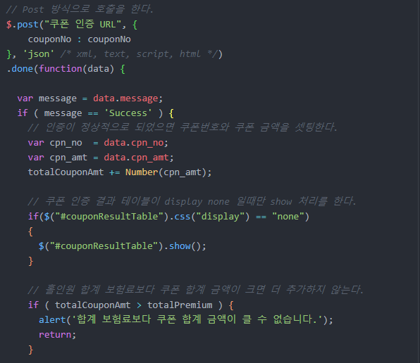 - 입력된 쿠폰 인증을 위한 ajax 통신을 하며 post방식으로 전송을 합니다.