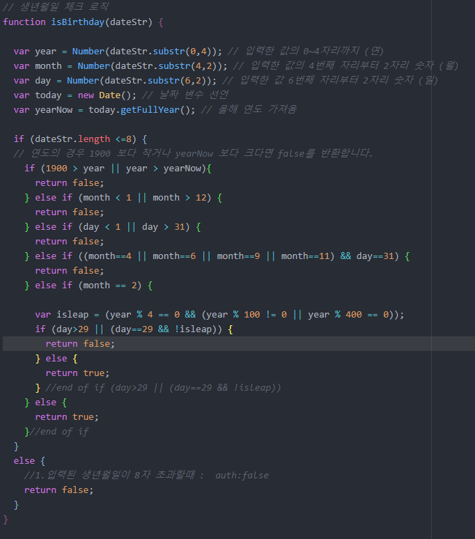 JavaScript로 input 입력값에 대한 생년월일 유효성 검사하기 1. 입력값 : YYYYMMDD 2. return 값: true / false 3. 2월 29일(윤년) 체크 function isBirthday(dateStr) { var year = Number(dateStr.substr(0,4))..